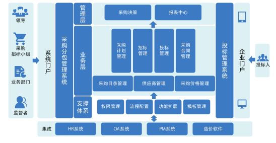 系统分为采购管理系统(公司内部招标采购管理系统)和电商(投标管理系统)两个子系统,本系统业务功能涵盖了从计划管理、任务管理、招标方案、招标管理、合同管理五大部分;其采购过程涵盖了公开预审、公开后审、邀请招标、询价采购、单一来源、应急采购六种采购方式。