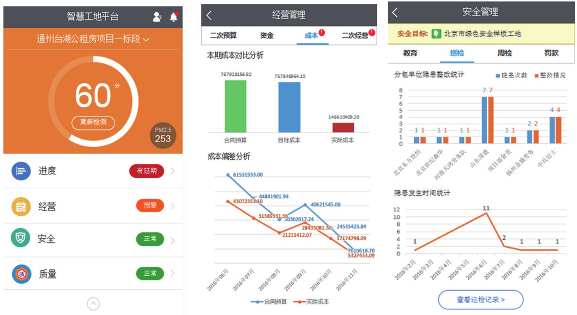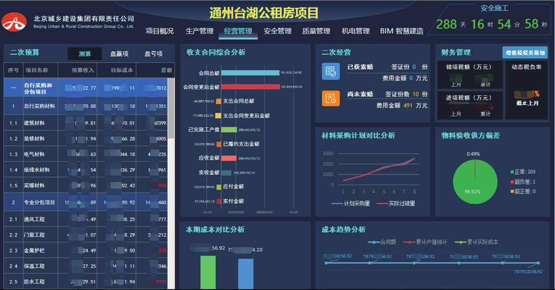 本项目经营管理,参考北京城乡项目成本管理制度和要求。重点在集成平台中体现,阶段性成本、资金以及合同履约等情况。同时,出于项目成本管理需求还将项目部使用的6686体育官网首页物资验收系统、6686体育官网首页物资管理系统等进行了整合与深度应用。