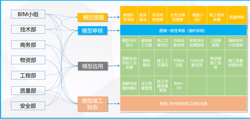 依据BIM目标,项目部制定了BIM实施标准,BIM实施规范,BIM成果交付标准等一系列标准文件;形成了一套基于BIM的设计、施工、资源、商务等的一体化BIM管理体系。