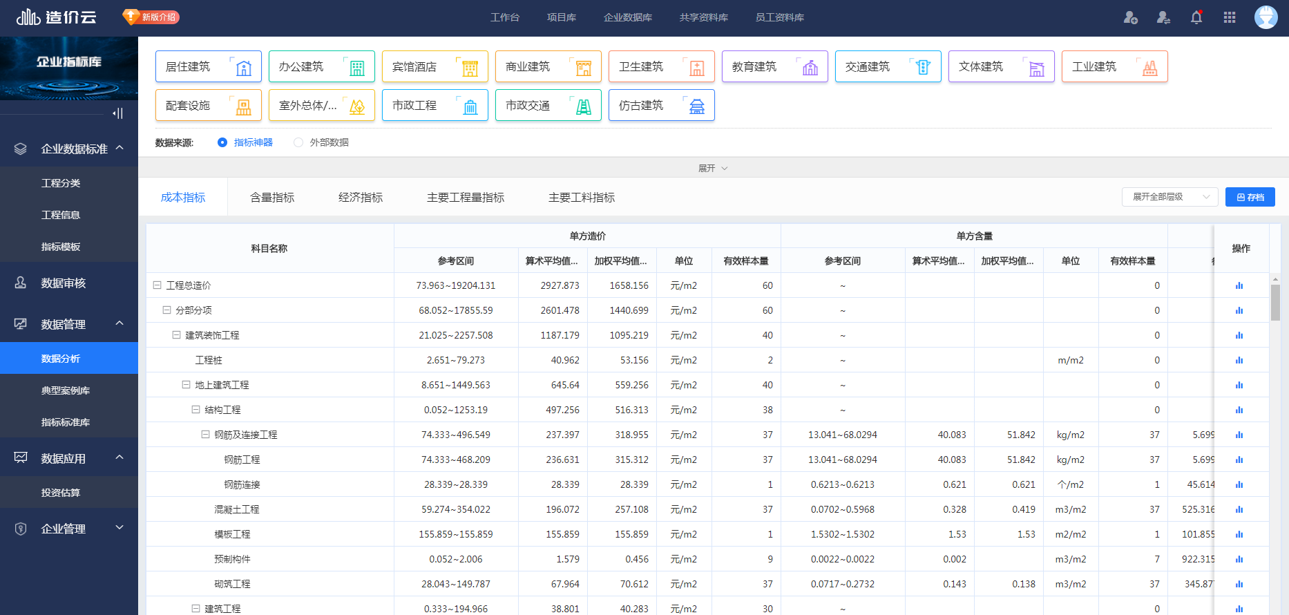 项目方案为解决施工成本测算及成本数据库的沉淀,首先基于总部层面建立统一的成本科目标准、成本测算模板库、企业定额及材料指导价格等标准计价依据,通过产品让项目一线成本人员直接调用统一的标准及模板作业,快速进行标前成本或目标成本测算的同时能够一键提交审核,清晰数据来源方便调整;各项目的成本价格又可以分别入库整理,多维度分析得出成本指标价格、主材价格及分包清单价格。
