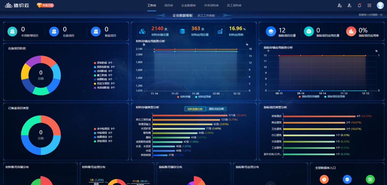 企业项目数据通过端云大数据技术为企业快速积累材料和指标数据,数字化项目大屏将零散数据进行有效整理形成可视化数据资产,通过可视化的大屏清晰展现目前企业的应用情况。实现企业数据实时共享,资产有效应用,快速高效积累企业指标数据资产,并且能快速获取类似项目指标区间助力历史项目精准估算,帮助企业建立“企业数据库”标准体系,提升企业核心竞争力,让每一个工程项目综合价值更优!