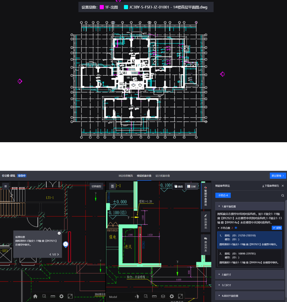 图模相符性审查•图模智能叠图对比,图模差异一目了然 •AI智能审查房建全专业构件位置关系、属性信息、空间用途信息 •二三维、大小窗、分屏等多种模式自由切换对比图模差异 •出具审查报告书,错误问题原因和位置构件定位清晰可查 |