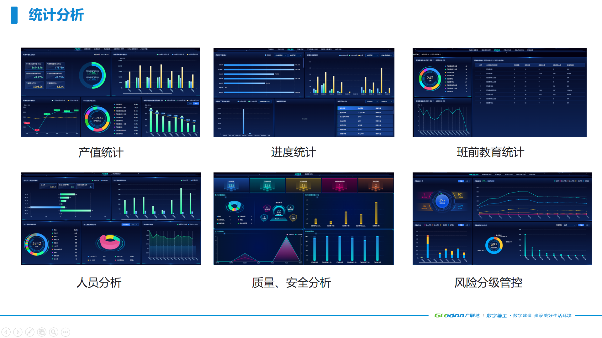 产值统计、进度统计、班前教育统计、人员分析、质量/安全分析、风险分级管控