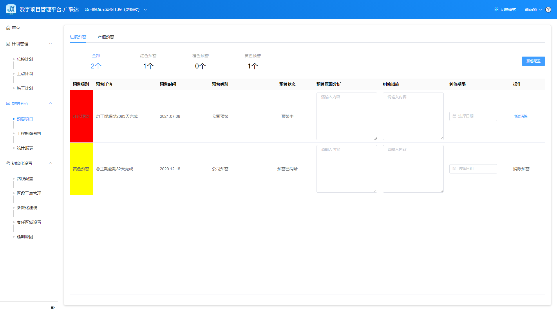返回项目整体进度偏差,分级预警