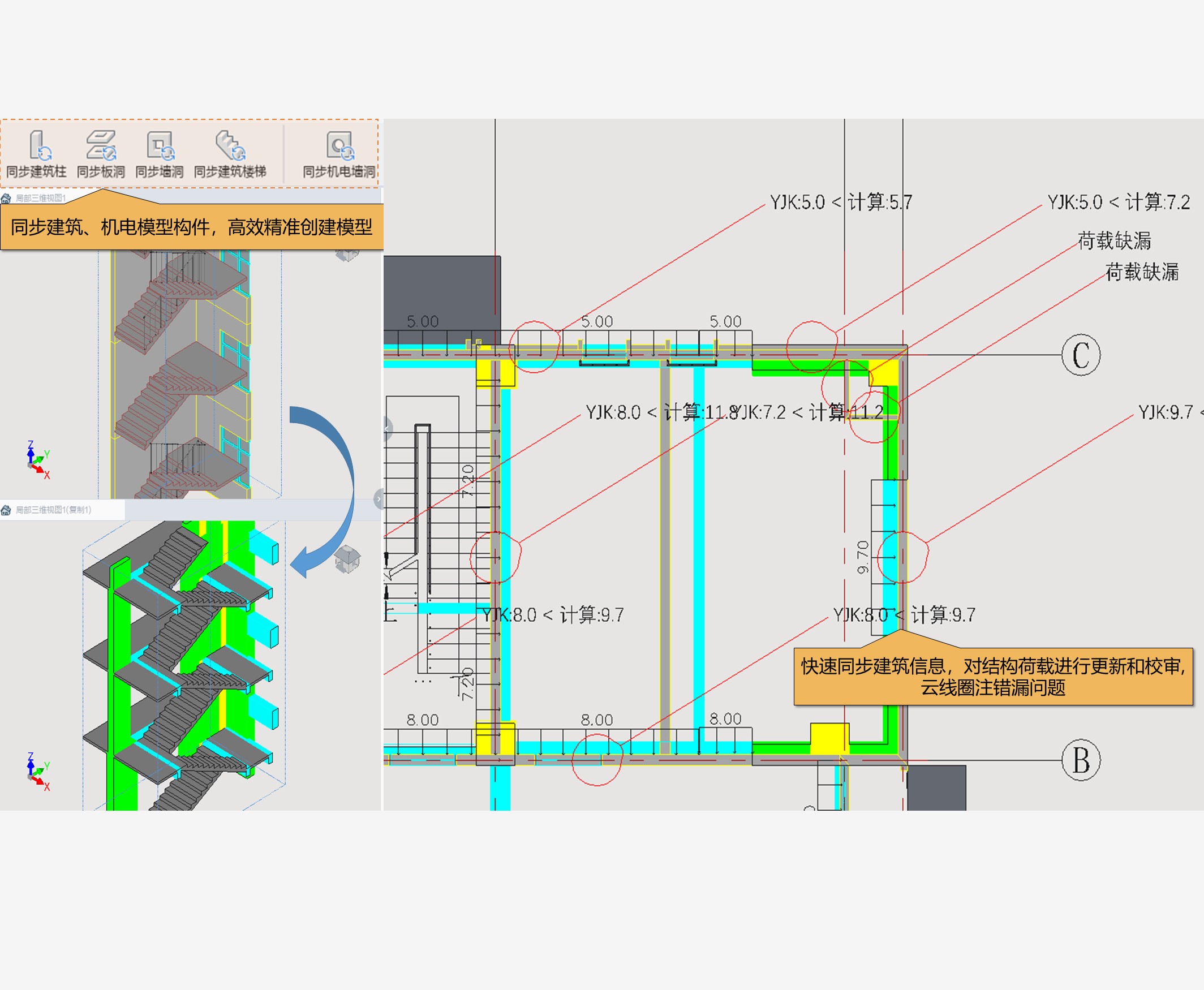 跨专业高效协同,精准同步建筑、机电模型信息,一键校核荷载信息与建筑、机电专业进行充分的构件级协同机制,同步建筑特定类构件、空间等信息,快速准确读取建筑模型墙体材料、门窗洞口、机电设备等数据自动计算荷载,一键校核荷载错漏问题,保证跨专业设计的一致性,实现各专业模型与结构设计模型高效互通与协同 |