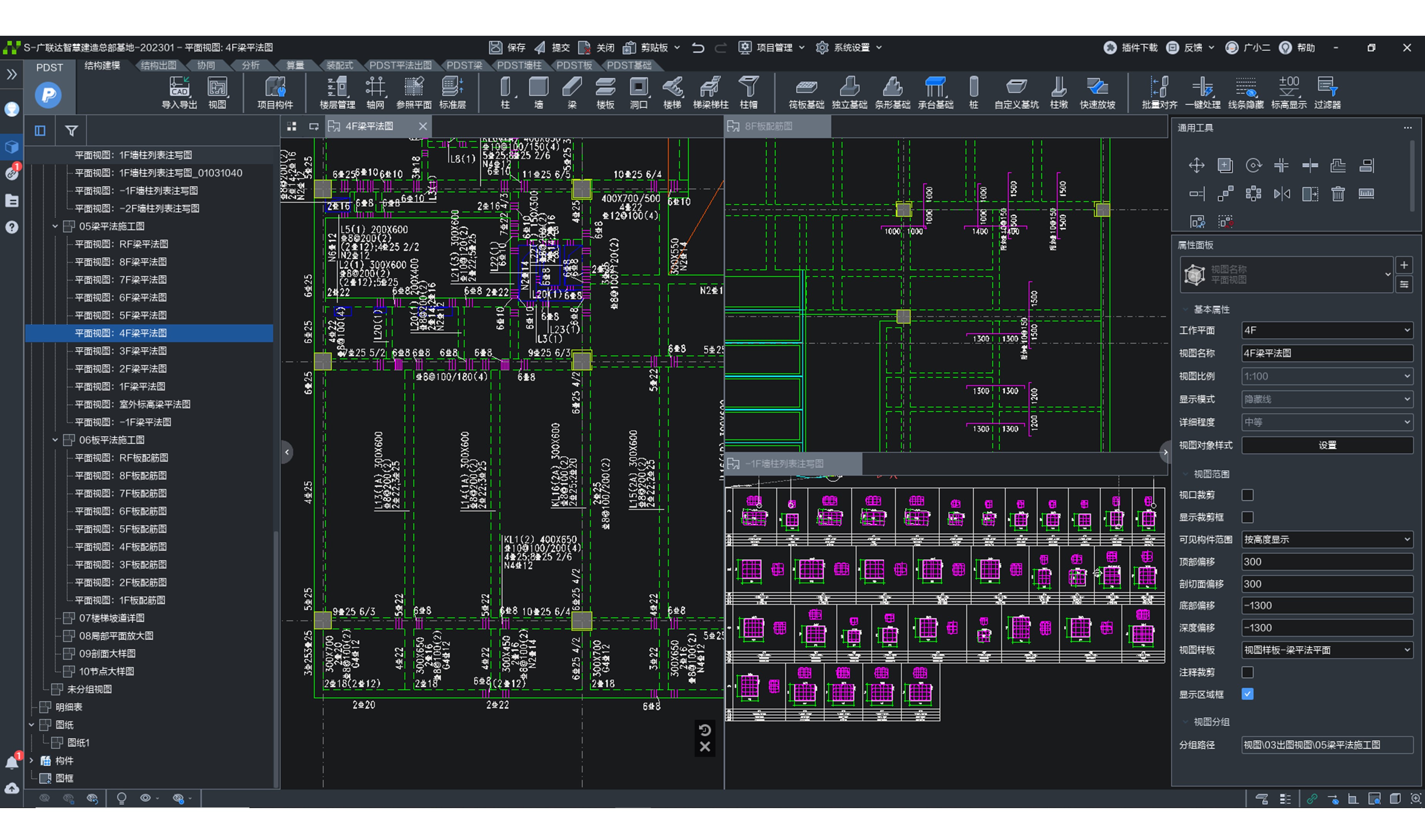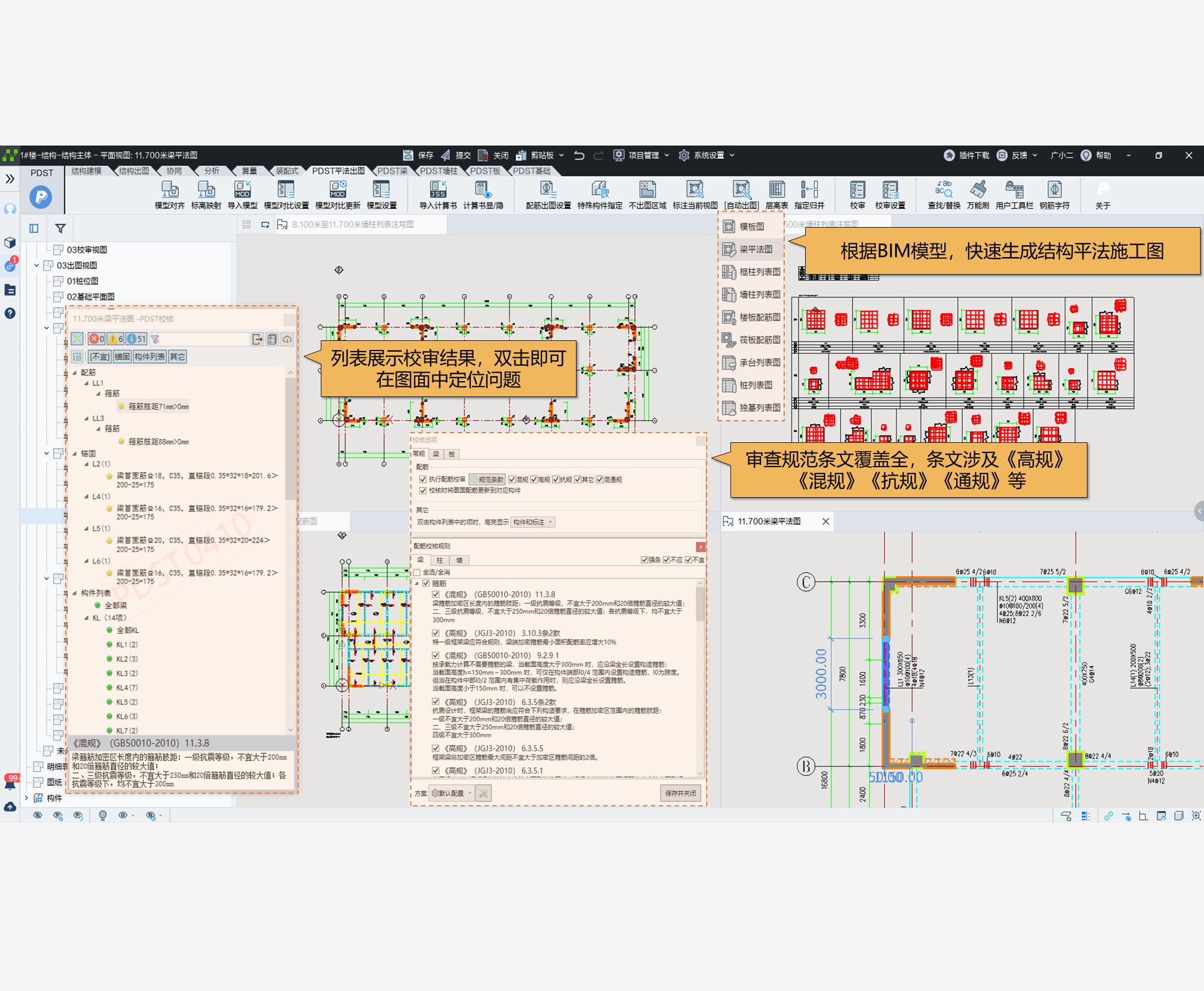 自动化生成平法施工图,智能处理文字避让;平法标注随心移,快捷调整平法表达;配备灵活的配筋助手,双击直接选筋;可生成梁板墙柱配筋图、基础配筋图、钢结构平面图及各类节点大样等全套结构图纸