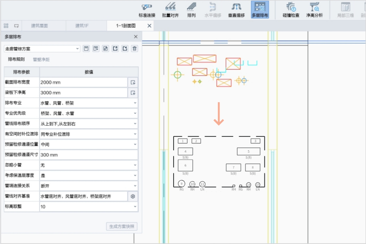 3 智能管综排布,一键管综方案• 碰撞检查,净高分析助力提升管综质量 • 基于剖面节点一键生成多个管综方案,方便比选优化 • 翻弯避让、排列对齐等丰富管综工具,提升管综效率 • 一键生成孔洞套管,满足提资、出图的需求 • 支持抗震支吊架快速建模、校核计算、输出计算书 |