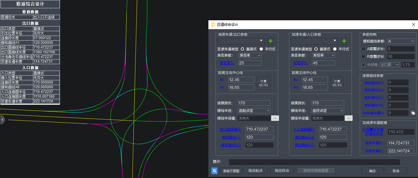 路线设计路线设计包括导入路线和设计路线两种方式,其中导入路线支持纬地、EICAD/DICAD、鸿业路线文件的导入;主线线形设计支持快速自动布线、线形控制试算、S/C联合设计、快速跳转编辑,立交线形设计支持万能接线,自动判断所选线元进入对应设计界面。智能判断线形要素类型及位置,匹配最佳线形,立交变速车道设计自动判断出入口类型、方向,直接、平行式一键切换 |