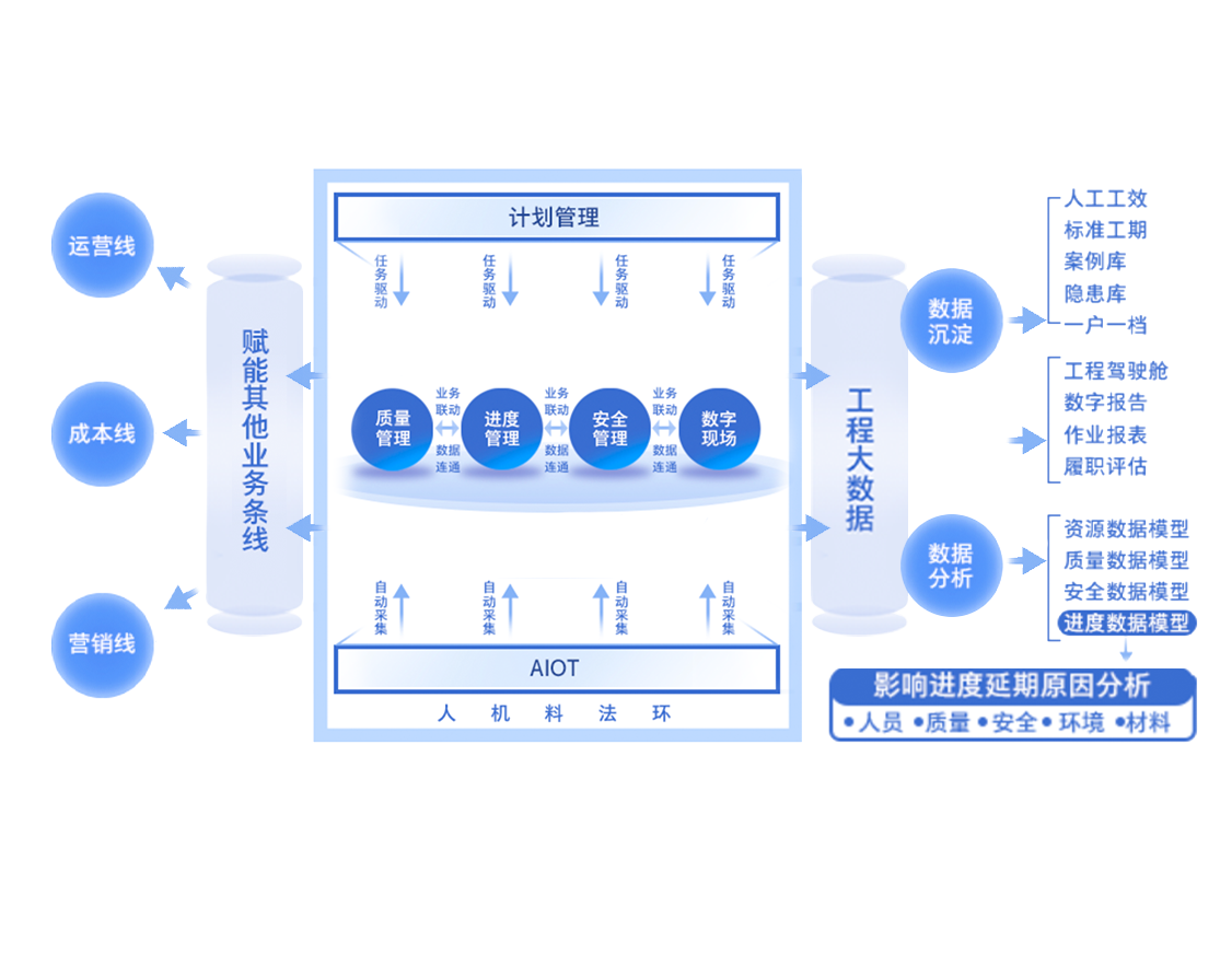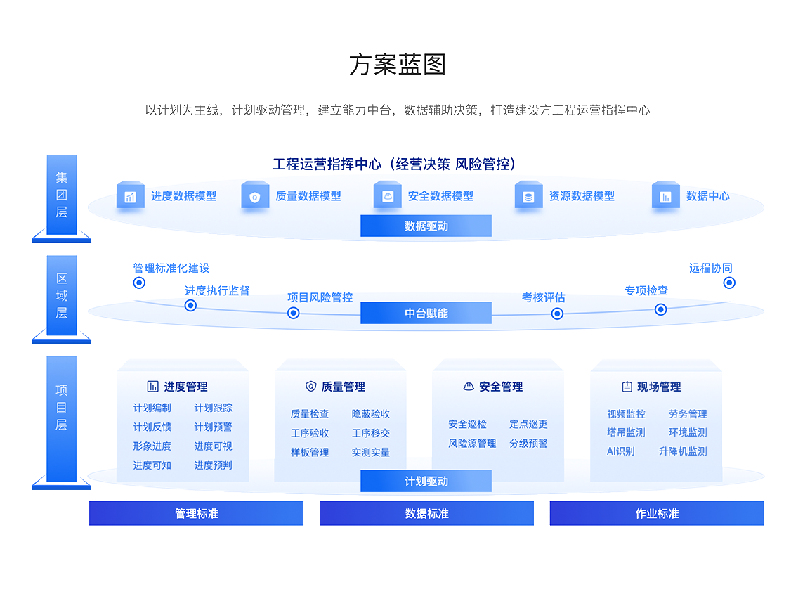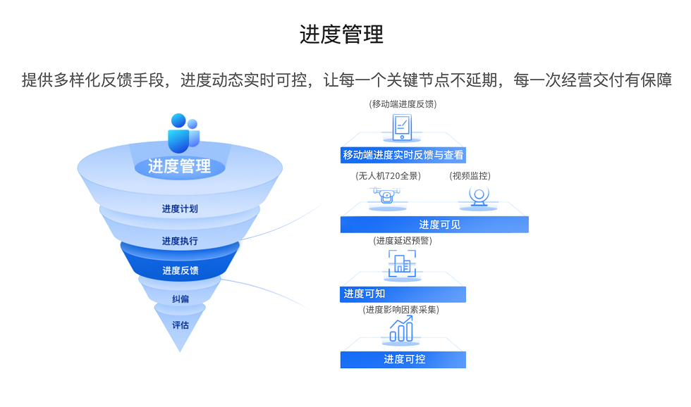 覆盖进度计划、执行、反馈、纠偏、评估全流程,借助移动报表、无人机全景、视频监控等,实现进度可见、可知、可控,保障关键节点不延期,为经营交付筑牢根基,助力城投房开项目高效推进。