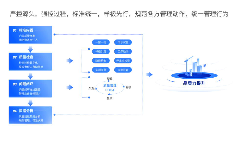 秉持 “严控源头、强控过程、标准统一、样板先行” 理念。标准内置明确质量要求与责任人,数字化质检匹配整改人,问题闭环跟踪问责,数据看板辅助决策。以 PDCA 循环规范管理,助力品质提升。