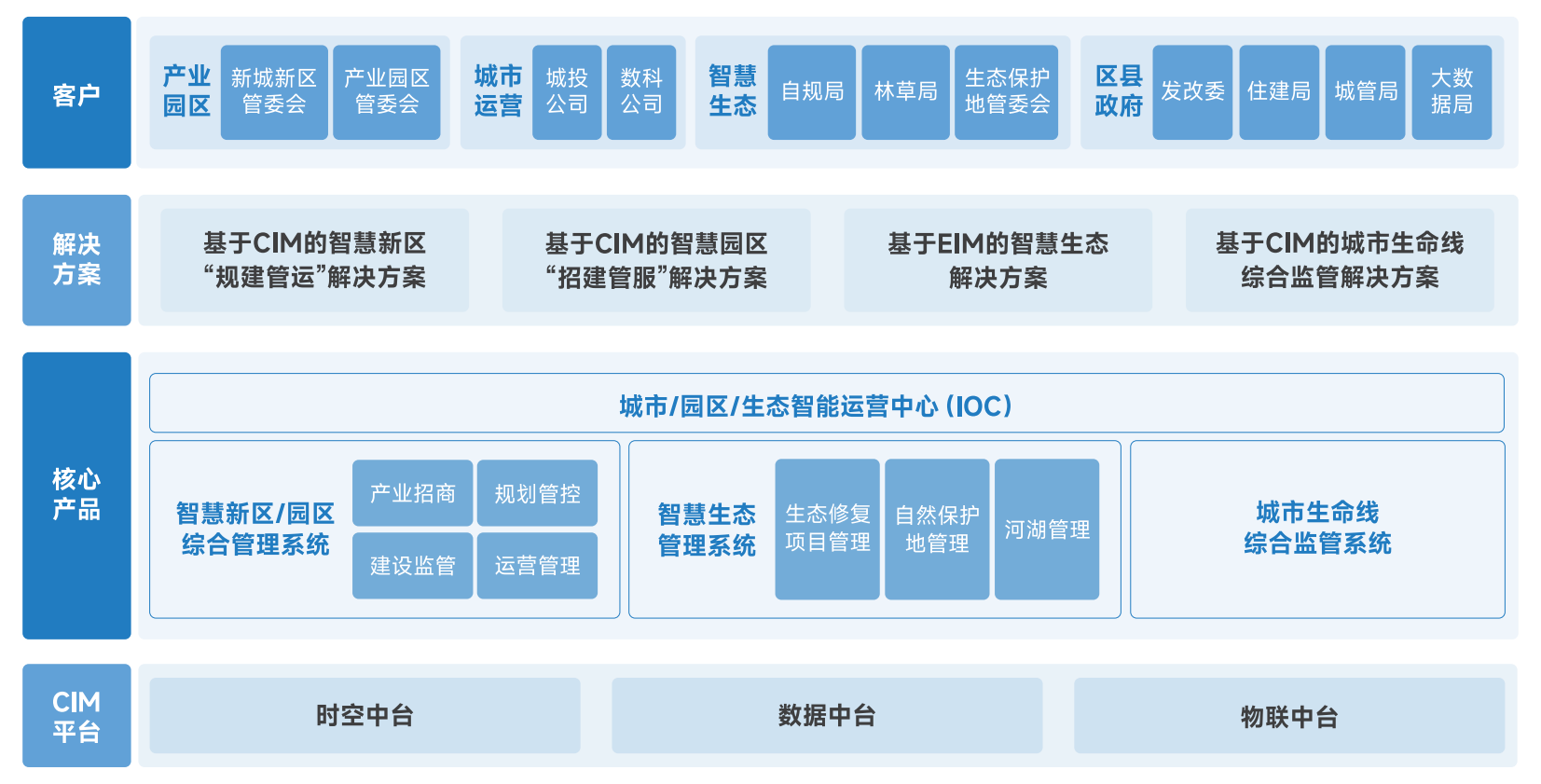 基于自主研发的CIM基础平台,围绕城市发展“规建管运”全生命周期应用和生态治理“修复与保护”全生命周期监管两大核心业务,通过搭建智能城市运营中心IOC,为城市运营方、政府委办局和生态伙伴ISV以及智慧城市产业链各参与方,提供“两横、两纵”为体系的软硬件产品、解决方案与相关服务。