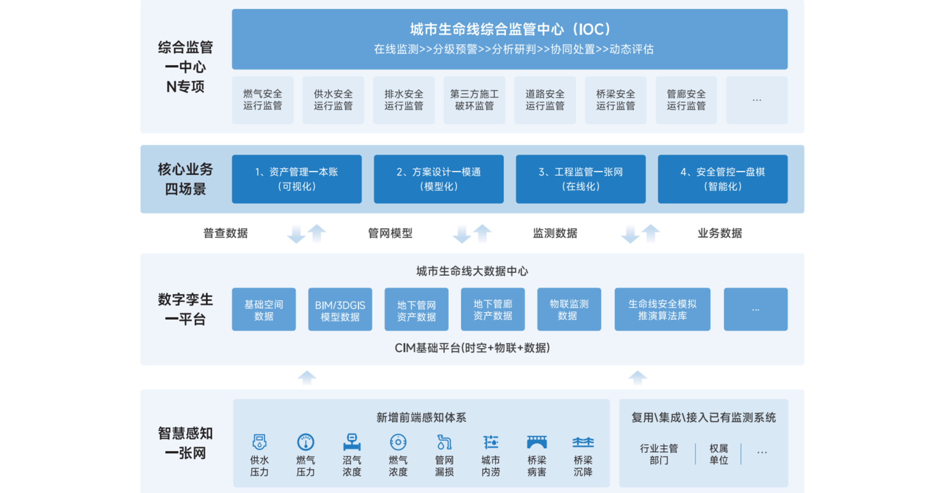 基于数字孪生理念和CIM技术,以三维模型为信息载体,通过互联网、物联网实时感知城市生命线安全运行状态,实现可视化集中管理、实时运行预警、数据决策和协同联动,建立“能监测、会预警、快处置”的城市生命线安全综合管理服务体系,创新城市生命线的数字化运行监测新模式,打造高效、安全、智能的安全韧性城市。