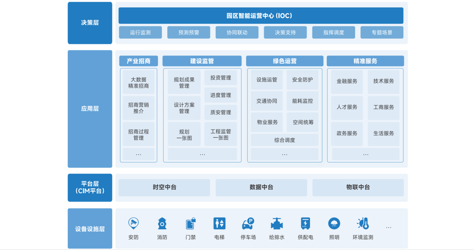 将数字孪生技术与园区业务深度融合,立足“协同增效、智能集约、绿色发展”,创新提出园区“物理+数字”双开发模式,针对园区产业招引、建设监管、运营管理、精准服务等核心诉求,基于CIM平台,打造数字化、在线化、智能化的园区综合管理平台,实现“产业招商全周期精准服务、规划建设全过程高效监管、运营管理全空间精细治理、园区服务精准全覆盖”。