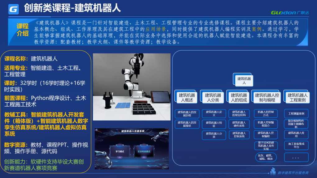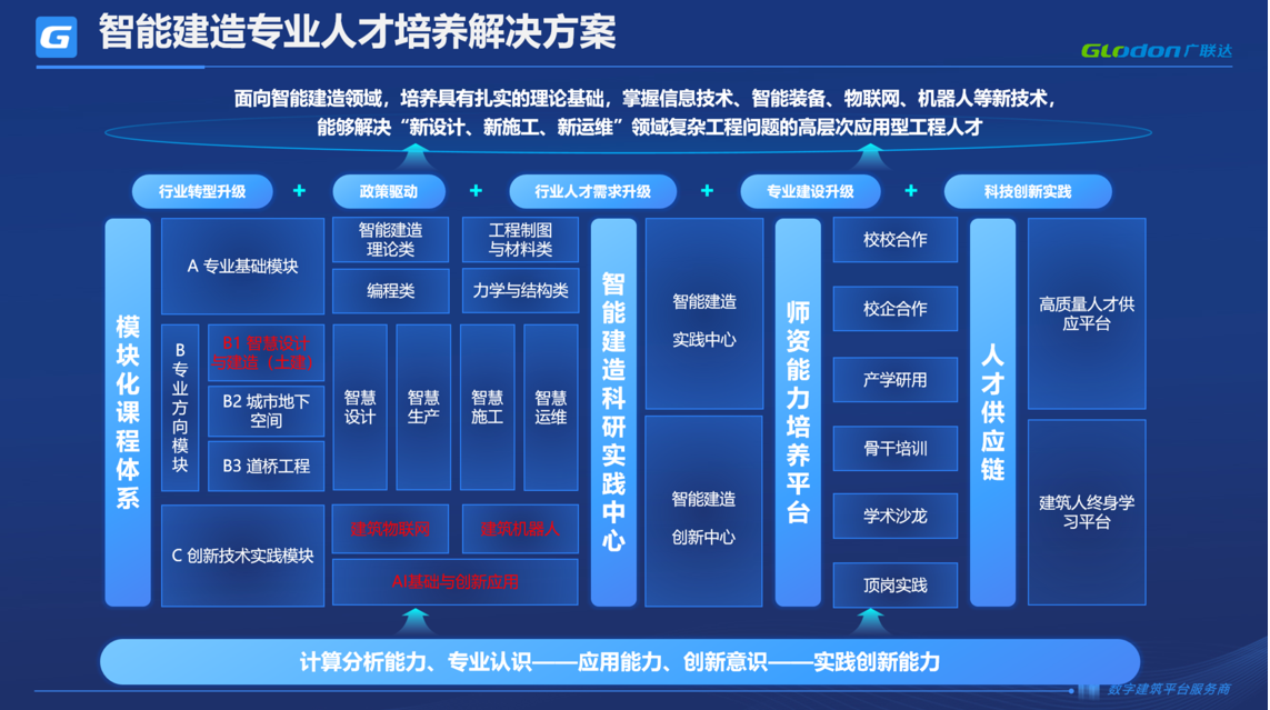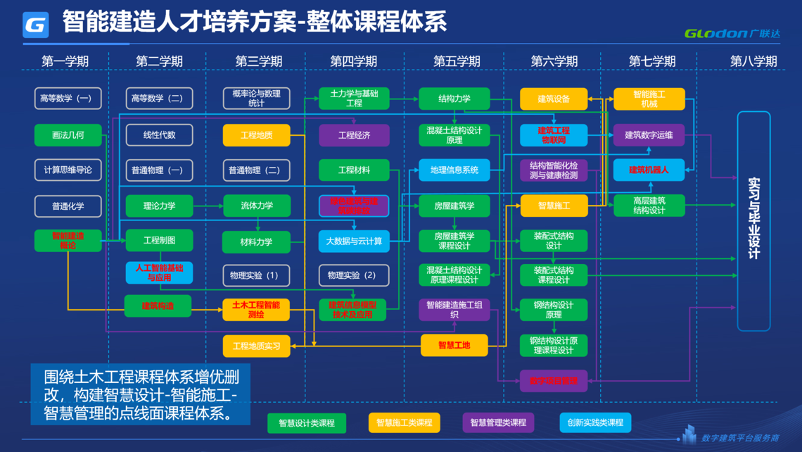 我们提供专业课程、支持条件、师资、学生就业一体化解决方案,课程方面我们聚焦于智能建造的专业核心及创新课程体系建设,实践教学方面与创新、科研紧密结合。