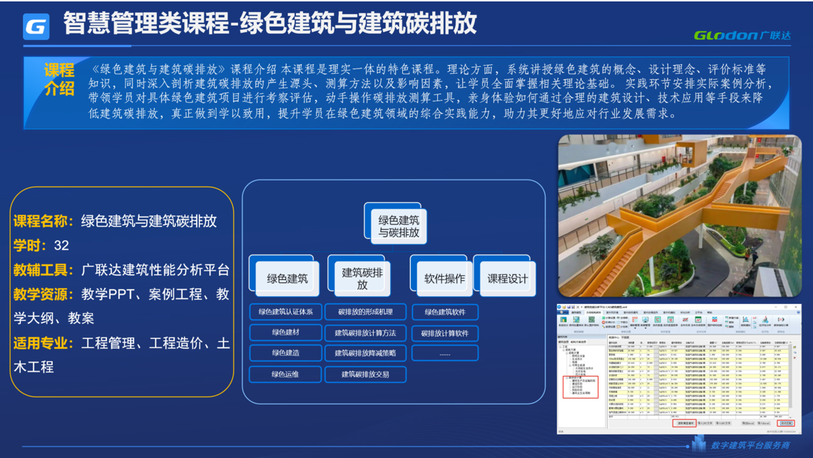 《绿色建筑与建筑碳排放》课程让学生掌握绿色建筑和建筑碳排放的体系、标准及计算方法,结合行业碳排放计算平台,培养学生绿色建筑理念,以及碳排放的计算能力。