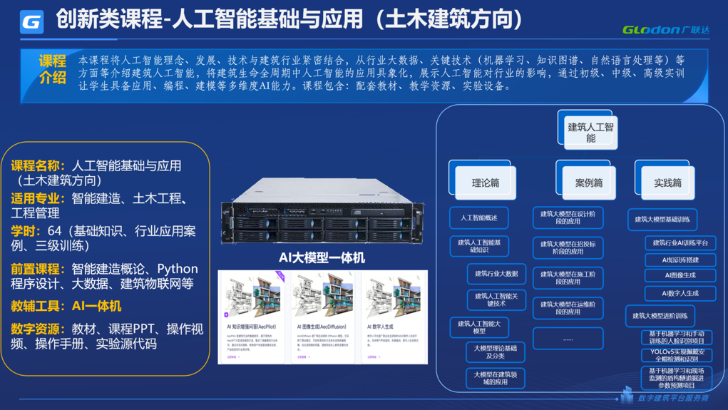 《人工智能基础与应用(土木建筑方向)》课程,让学生了解人工智能完整理论体系的同时,聚焦人工智能在建筑全生命周期的综合应用,培养学生建筑专业知识训练的方法和实践能力。